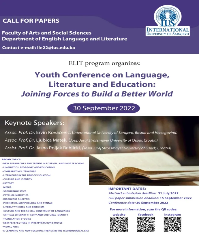 Youth Conference on Language, Literature and Education: Joining Forces to Build a Better World is organized by the ELIT/ELT Department of the International University of Sarajevo, in cooperati